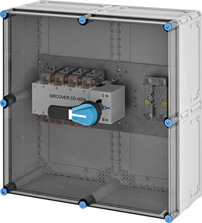 - Raccordement du réseau et du réseau de secours par le bas, système consommateur par le haut, modifiable